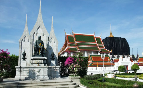 在金山寺,您可以游覽顯眼的“普考同寺”金色佛塔或“金山”。這個(gè)大型建筑物坐落在曼谷古城的一座高山上,可謂歷史悠久,歷經(jīng)動(dòng)蕩。金山寺由拉瑪三世 (1787–1851) 始建,卻未能完工,而寶塔因?yàn)榈刭|(zhì)柔軟而倒塌,成為廢墟。您今天看到金色寶塔是拉瑪四世和拉瑪五世統(tǒng)治期間所建,實(shí)際上是建筑在原址的廢墟之上。300 級臺(tái)階直達(dá)塔頂露臺(tái)和供奉從印度帶回來的佛陀圣物的寶塔。