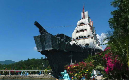 妙島位于芽莊東南,是一座景色優(yōu)美的觀光小島,島上有沙灘和海盜船外形的水族館,還有一個繁忙的漁場,你也可參加一些水上娛樂,這座島是很多游客來芽莊都會參與的“芽莊四島游”的其中一座,是人比較少的一個島,是個寧靜的地方。但是一般都是喜歡出海去釣魚或者是潛水,這里的水質(zhì)倒是挺好的,晶瑩剔透,可見度特別高。去妙島游玩,還沒下船就能看到妙島(Hon Mieu)上巨大的海盜船和水族館。走過一條開滿三角梅的長廊,就看到一只巨大的海魚張著大口,這便是水族館的入口。如果不進(jìn)館,可以坐在碼頭邊抱個椰子喝著椰汁,吹著海風(fēng),眺望碧海藍(lán)天,也是一種愜意的享受。